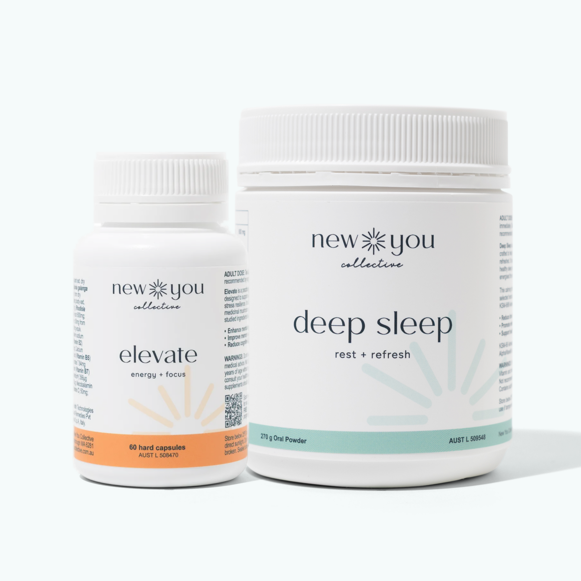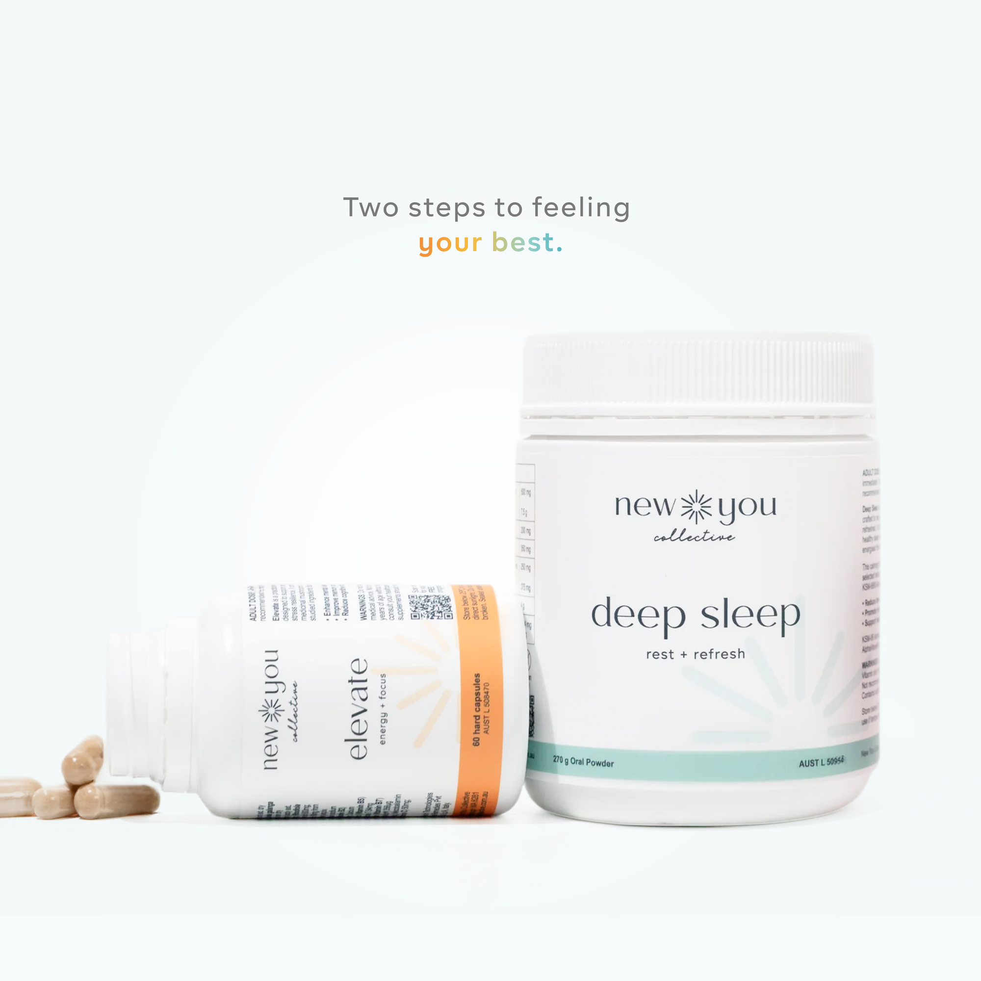 Meet New You Collective Elevate + Deep Sleep, your day-and-night support system, crafted by practitioners to help you feel clearer, calmer, and more energised from morning to night.