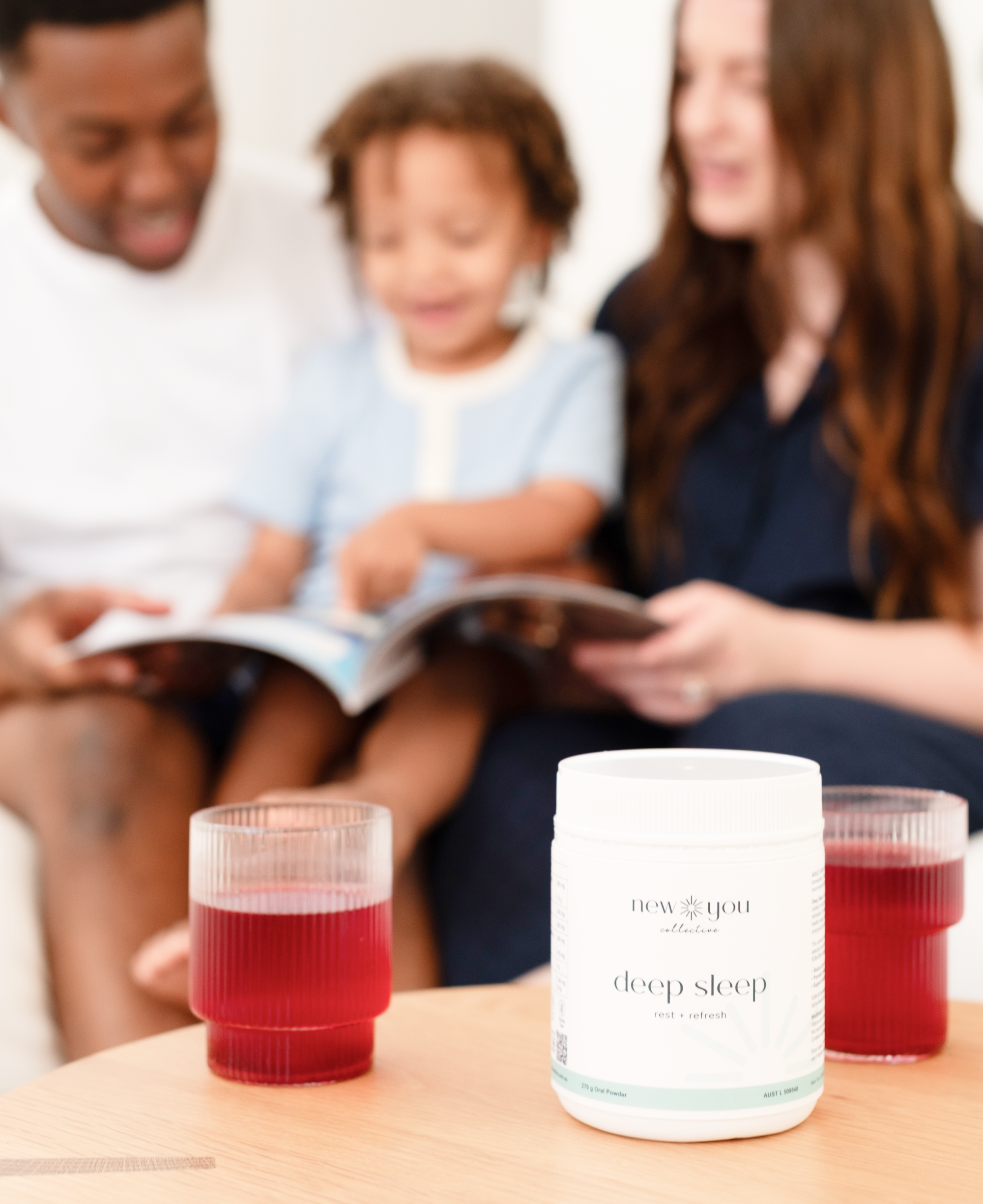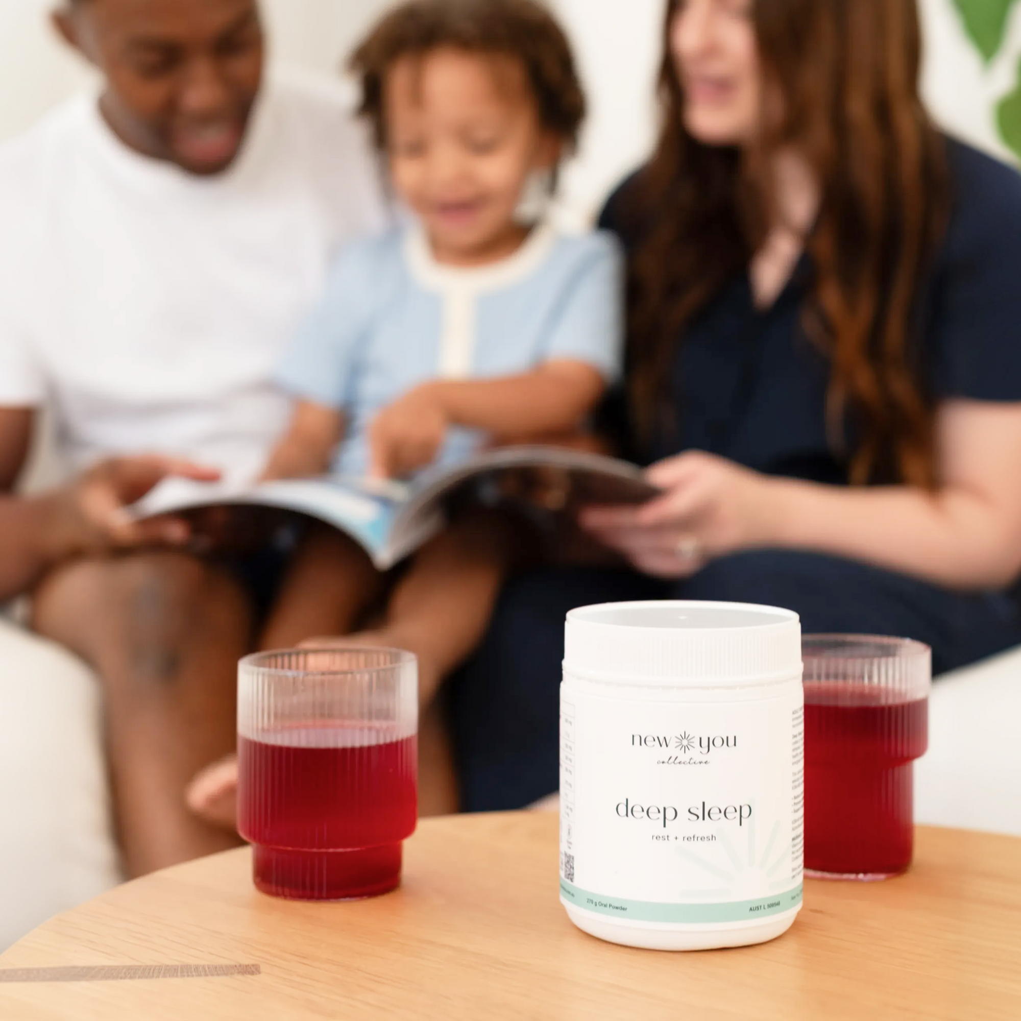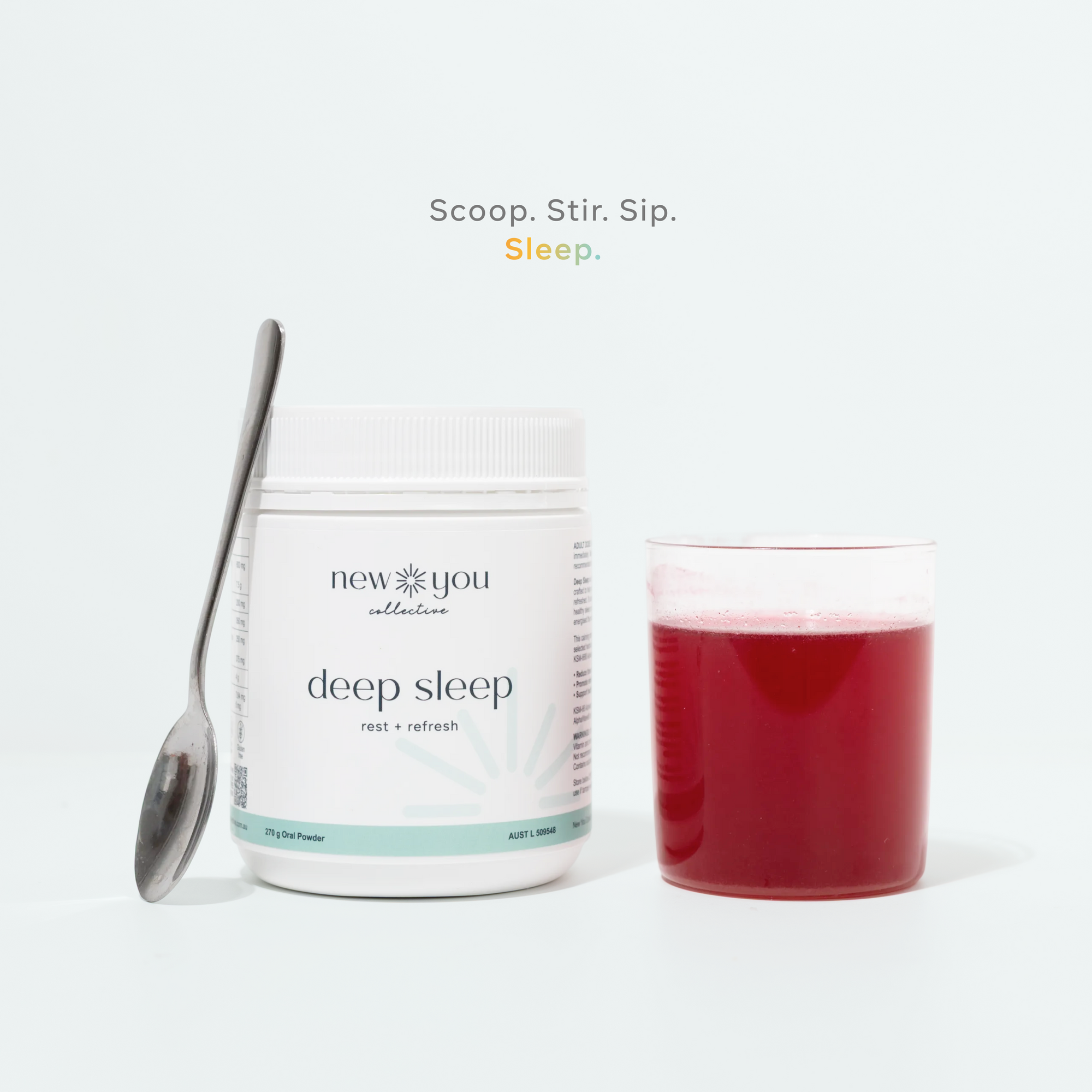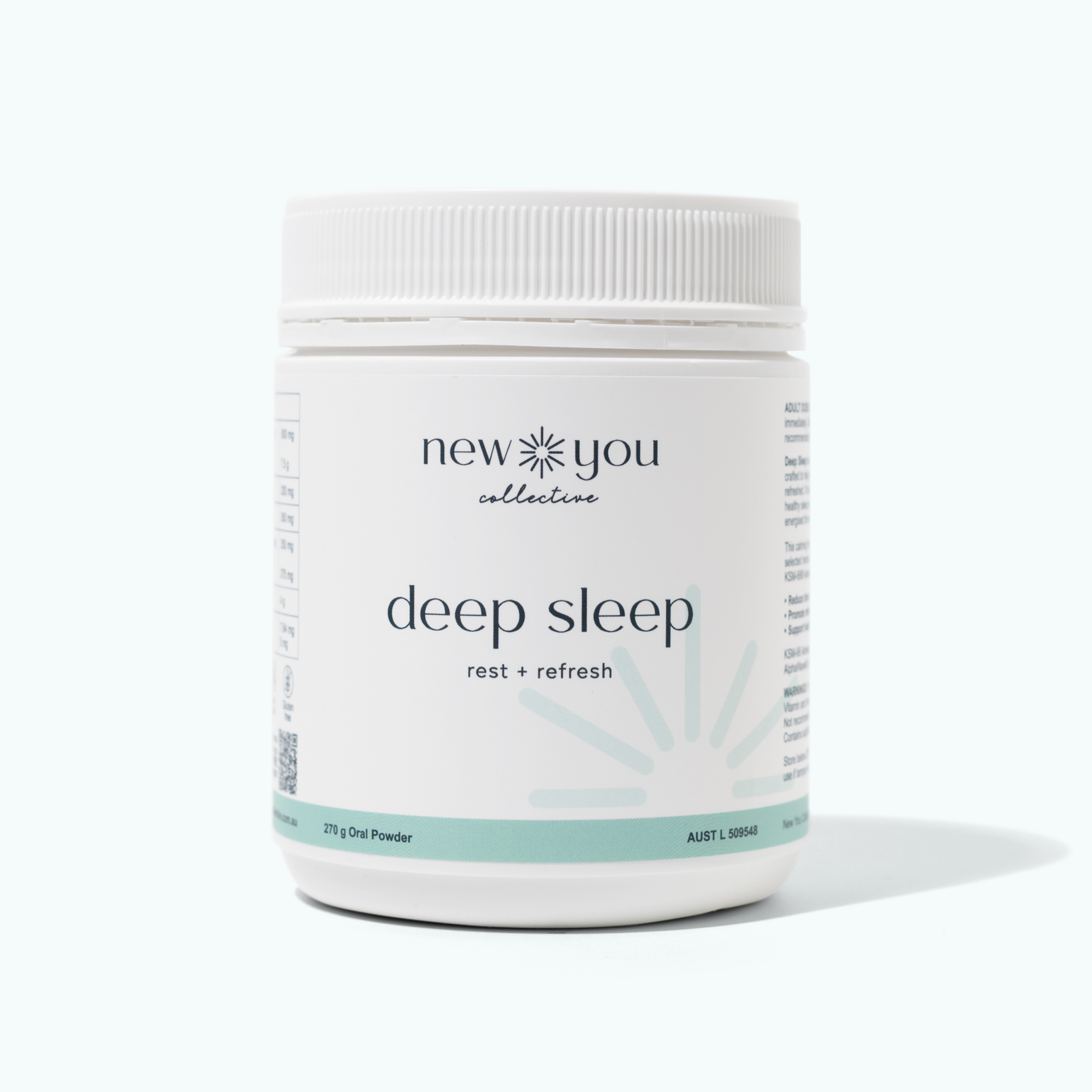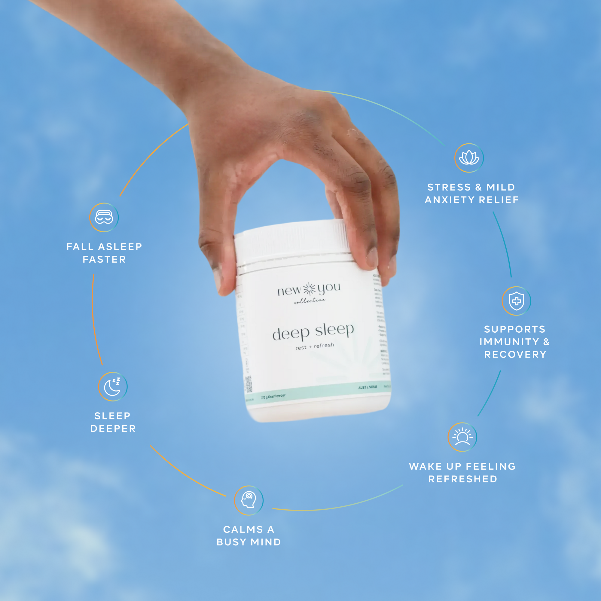 New You Collective Deep Sleep helps quiet a racing mind, relax your body, and support deeper, more restorative sleep. Fall asleep faster, stay asleep longer, and wake up feeling refreshed – not groggy, not foggy, just better.