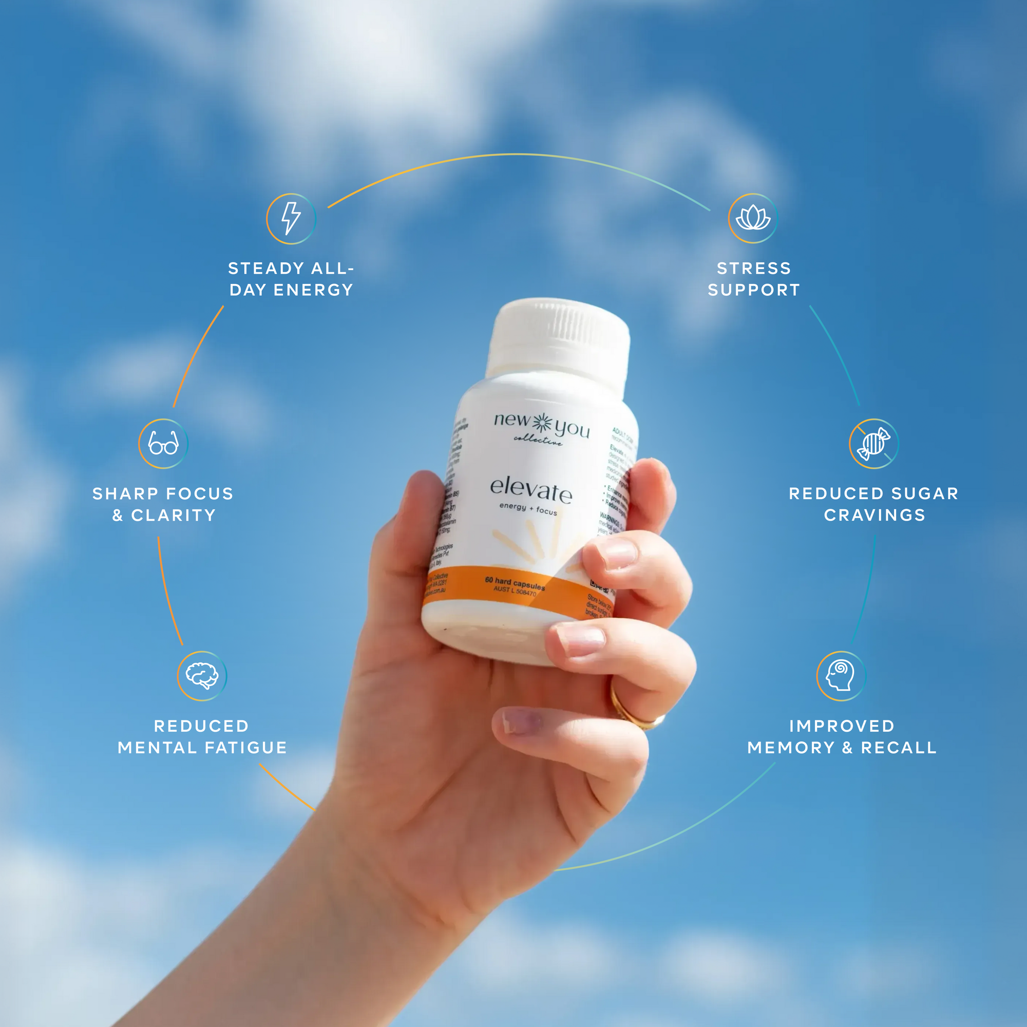 New You Collective Elevate supports focus, memory, and mental stamina by regulating the systems behind real energy. No jitters, no crashes, no artificial highs – just steadier days, smoother afternoons, and less reliance on caffeine over time.